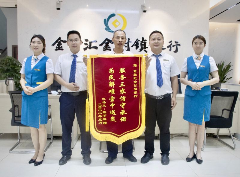 2022年6月1日早上,位于金堂县十里大道的金堂汇金村镇银行刚刚开门营业,客户陈先生特意送来一面锦旗,上书“服务三农信守承诺 为民解难雪中送炭”,对汇金银行快速发放小额信用贷款解决他急需用款的难题表示感谢。