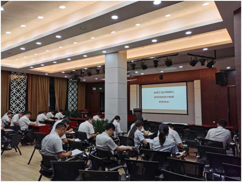 在培训阶段,信贷条线业务管理部门组织学习了中国人民银行成都分行营管部、金堂县支行关于涉农贷款专项核查的相关要求,再次培训了涉农贷款统计制度的主要内容。考试采取闭卷形式,内容涵盖涉农贷款专项统计制度、金融统计常见易错点、贷款“三查”等应知应会的知识,考试通过率100%。