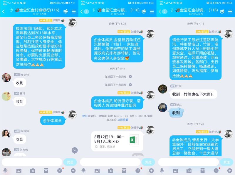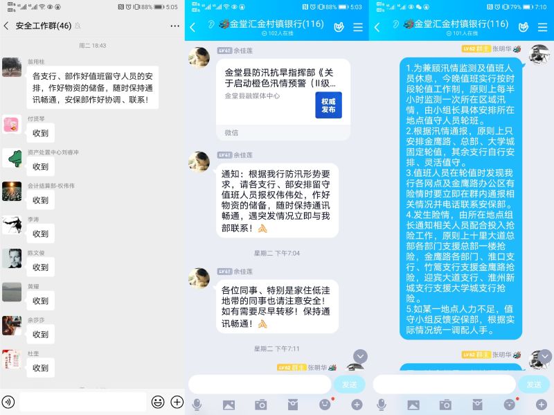三是坚持以人为本、确保安全第一。坚持将客户和员工人身安全放在首位,先后14次发布安全预警提示,要求全员提高警惕、安全通勤,低洼地点员工及家属提前转移。定时监测、收集、掌握员工安全状况,按照总部安排统一行动,避免擅自行动发生意外。迅速将总部一楼重要档案、设备、物品转移到二楼存放,其余防汛部位也做好打包转移准备。
