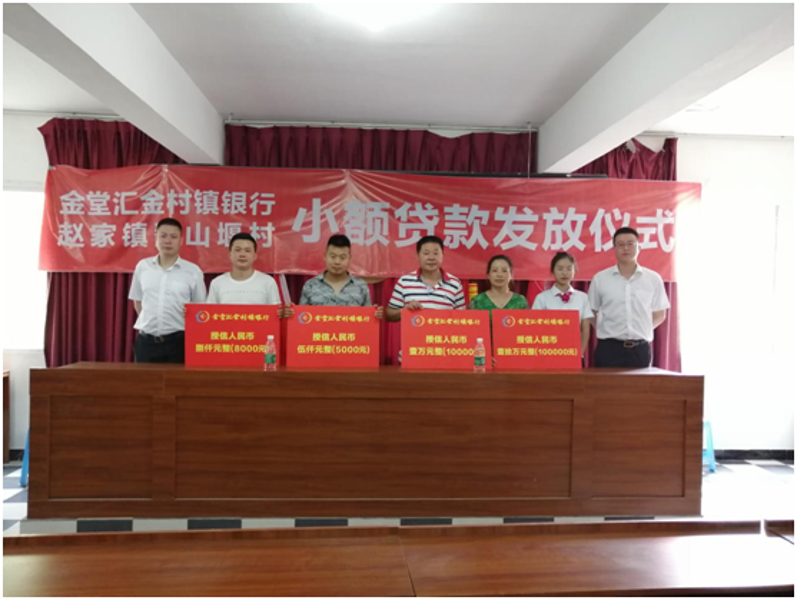 2020年6月4日,金堂汇金村镇银行在金堂县赵家镇翻山堰村举行小额贷款发放仪式,现场为14户农户代表发放小额信用贷款389000元。