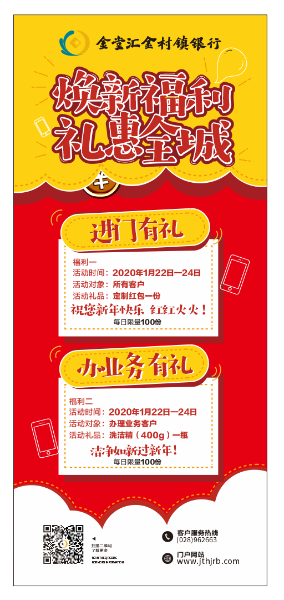 1月22日至24日期间,我行营业部举办“焕新福利、礼惠全城”活动。凡活动期间到我行营业部的客户,均可领取1个定制红包(每日限量100名);办理金融业务,可领取1份礼品(每日限量100名)。热忱欢迎新老客户前来咨询、办理业务!