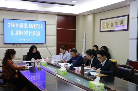 2019年1月24日,金堂汇金村镇银行第二届监事会第十七次会议在在十里大道总部会议室顺利召开,会议由监事长艾平主持,我行监事出席会议,四川银保监局金堂监管办监管员粟玉兰莅临指导。
