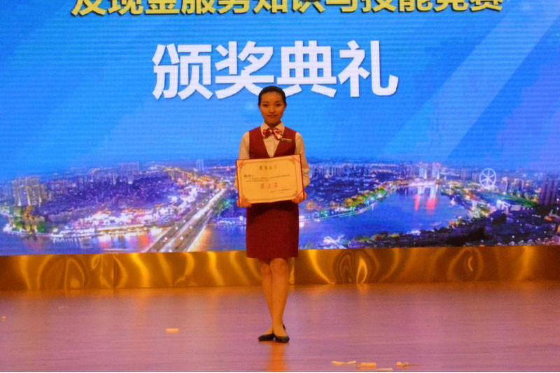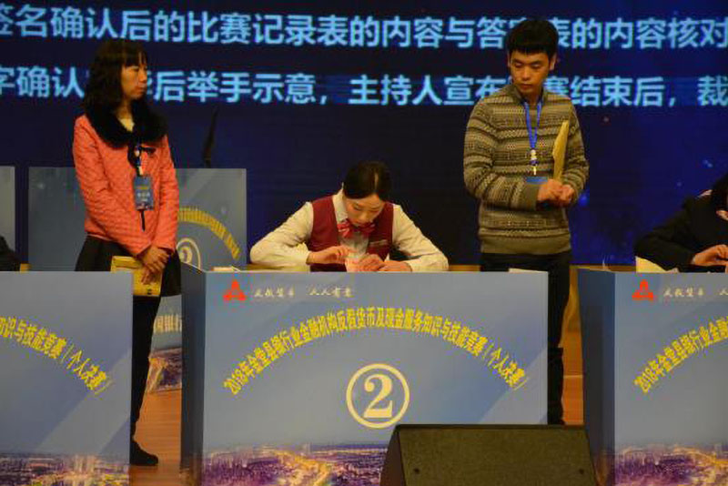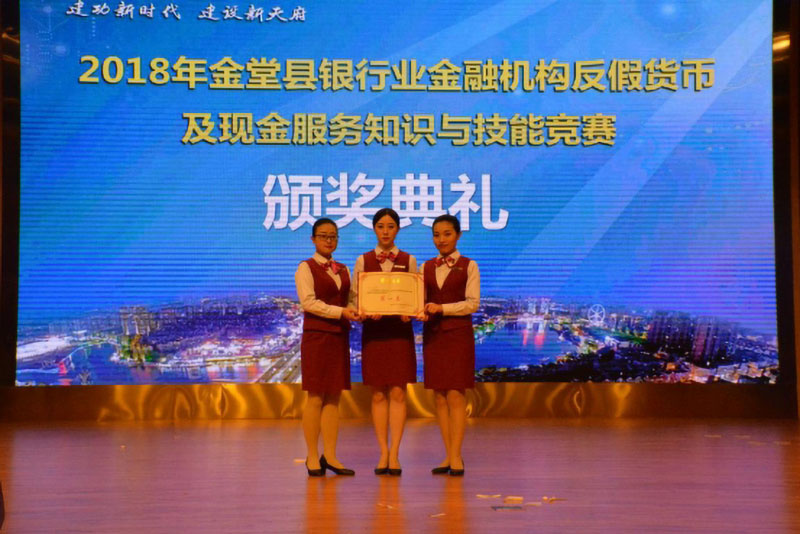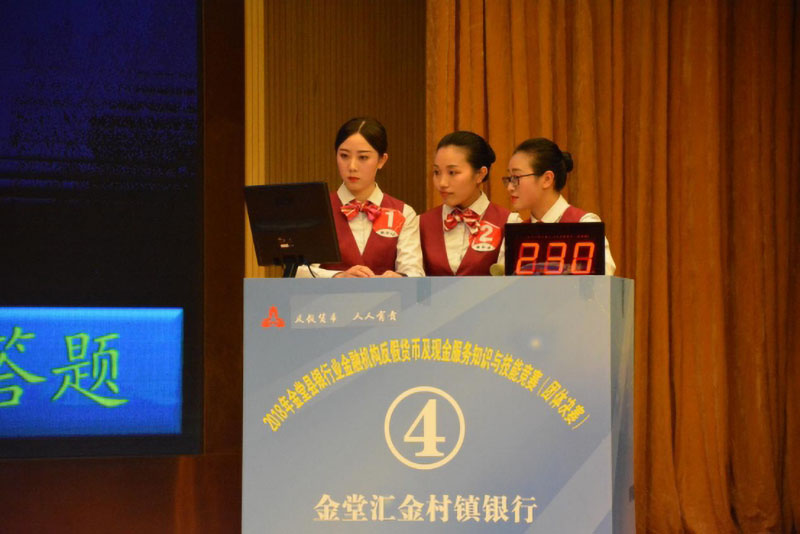 本次技能竞赛由金堂县总工会、人民银行金堂县支行主办,14家银行业金融机构协办,分为个人赛和团体赛,设置初赛、决赛两个环节,包括人民币理论考试、点钞竞技、识假竞技、知识竞答等内容。在初赛阶段,我行共派出3名选手参赛,其中刘江桃、林玲分别以个人总分第一名和第三名进入决赛,刘江桃、林玲、钱晓芸组成汇金银行代表队并以团体第一名进入决赛。