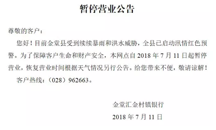 洪灾期间金融服务被迫暂停,洪灾过后金融服务需求激增,恢复网点服务成为第一要务。