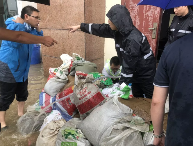代光辉副行长带领勇士们冒雨装沙袋、搬沙袋、垒沙袋,七次冲锋,在发电机房、配电房、大楼主入口构筑、加固拦水坝。