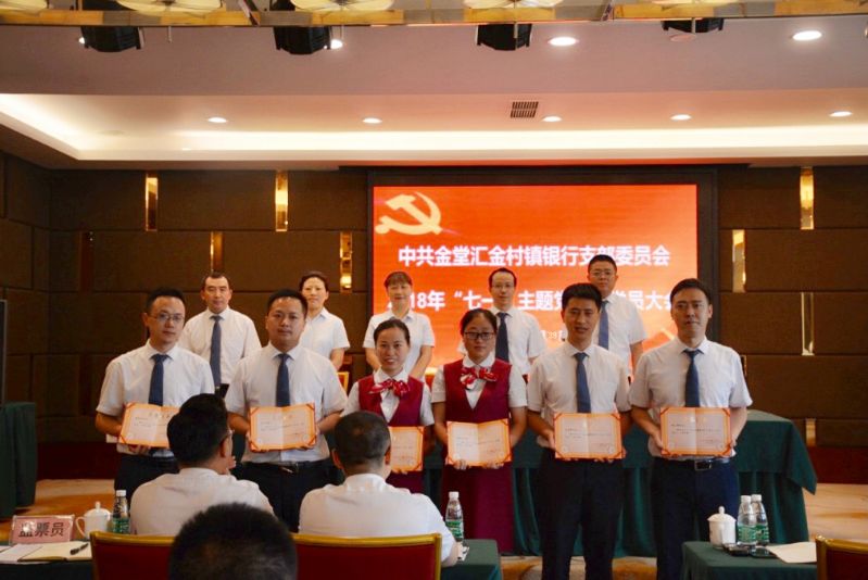 党支部副书记、行长吴鲜平通报了2018年民主评议党员结果以及2017-2018年度优秀党员名单。党支部书记、董事长甘永军,党支部副书记、行长吴鲜平,纪律委员、监事长艾平为代光辉、陈文俊、杜奎、郭庭明、林玲、钱晓芸、刘梦曦等7名优秀党员颁奖。优秀党员代表杜奎、郭庭明,入党积极分子代表张建中、龚勋进行了交流发言。