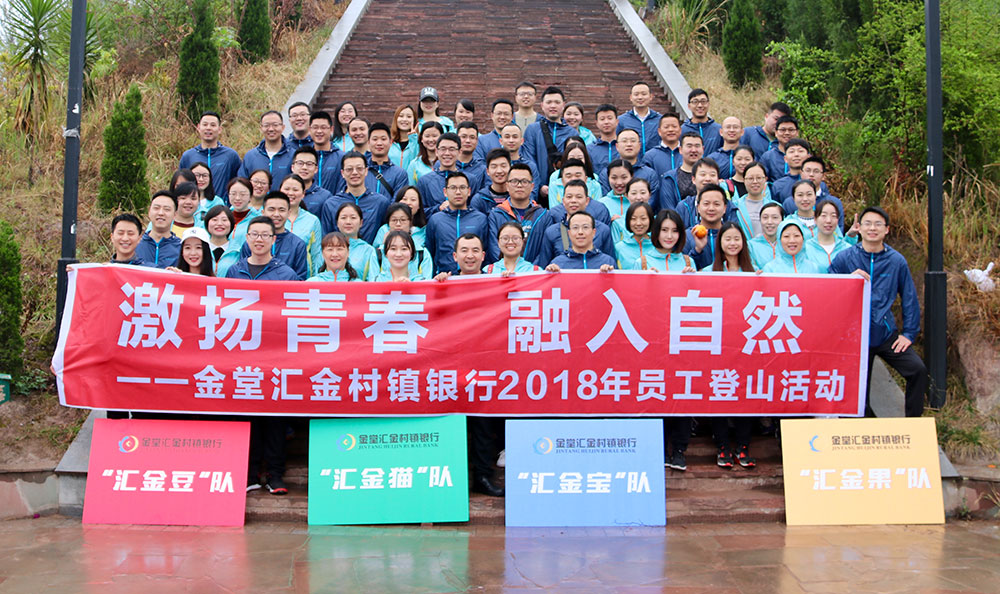 春意盎然满金堂,正是游人登山时。为丰富员工文体活动,推动汇金文化建设,弘扬“创新、规范、坚韧、厚德”的汇金精神,3月24日上午,金堂汇金村镇银行在金堂山举行了以“激扬青春 融入自然”为主题的2018年员工登山活动。