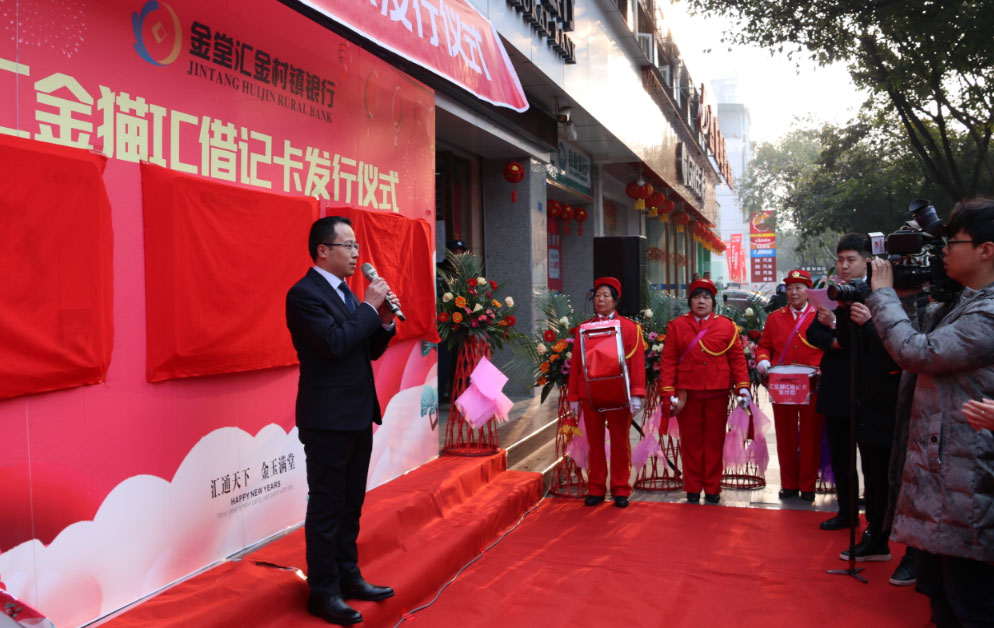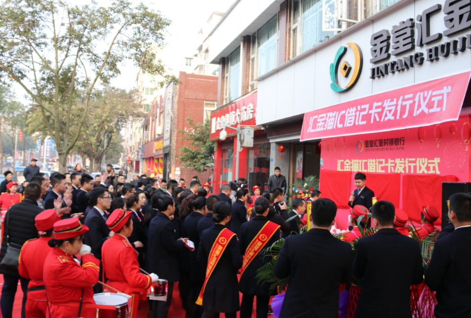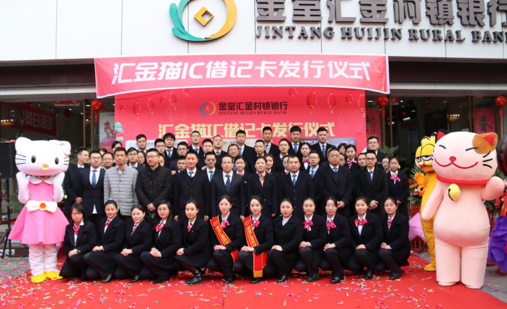2月13日上午,金堂汇金村镇银行举行汇金猫IC借记卡发行仪式,标志着金堂新名片——首张金堂冠名银行卡正式发行。