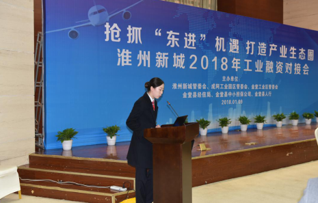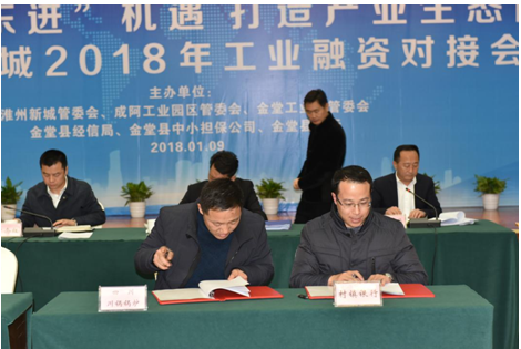 2018年1月9日,金堂县“抢抓’东进机遇 打造产业生态圈”2018年淮州新城工业企业融资对接会暨银企合作签约仪式在金堂县淮口镇成阿商务中心召开。淮口新城党工委副书记、管委会主任、金堂工业园区党工委书记尹念红,成阿工业园区党工委副书记、管委会常务副主任杨荣茂,县政府党组成员陈光华,淮州新城管委会副主任蒋炜,人民银行金堂县支行行长谭思贵,四川银监局金堂监管办、县直有关有关单位负责人,工业园区39家企业代表、县内外18家金融机构参加会议。