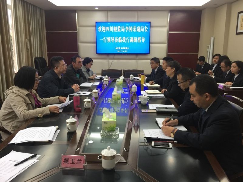 10月25日上午,四川银监局副局长李国荣及政法处、财务处、农金二处相关领导一行在四川银监局金堂监管办主任雷仕文陪同下,莅临我行调研指导工作。副局长李国荣一行首先参观我行营业部,随后与我行领导班子、部分中层干部在总部会议室进行座谈。