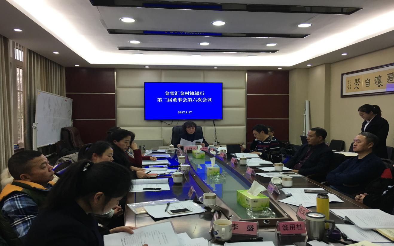 董事会会议一角本次会议审议通过了《关于金堂汇金村镇银行2017年经营发展目标的议案》、《关于金堂汇金村镇银行2017年经营发展暨全面风险管理指导意见的议案》等五项议案;通报增补董事邓诗维任职资格审批情况以及2016年12月29日四川银监局约谈“三长”的监管会谈情况;会议报告了金堂汇金村镇银行新业务系统上线情况、2016年主要经营情况及风险状况、2016年4季度股东关联交易报备情况、业务开展情况等事项;组织学习了《银行业金融机构全面风险管理指引》(银监发〔2016〕44号)文件。董事长甘永军在会上强调,2016年我行各项工作稳步推进,2017年将按照“优化结构、稳中求进”工作基调,坚持“稳增长、调结构、控风险”的总体思路和要求,践行“小微三农银行、社区银行、互联网金融银行”的市场定位,完善公司治理,加大风险防控化解,提升营销、创新能力,强化科技、人才支撑,探索精细化管理之路,狠抓实干,确保各项工作落到实处。
