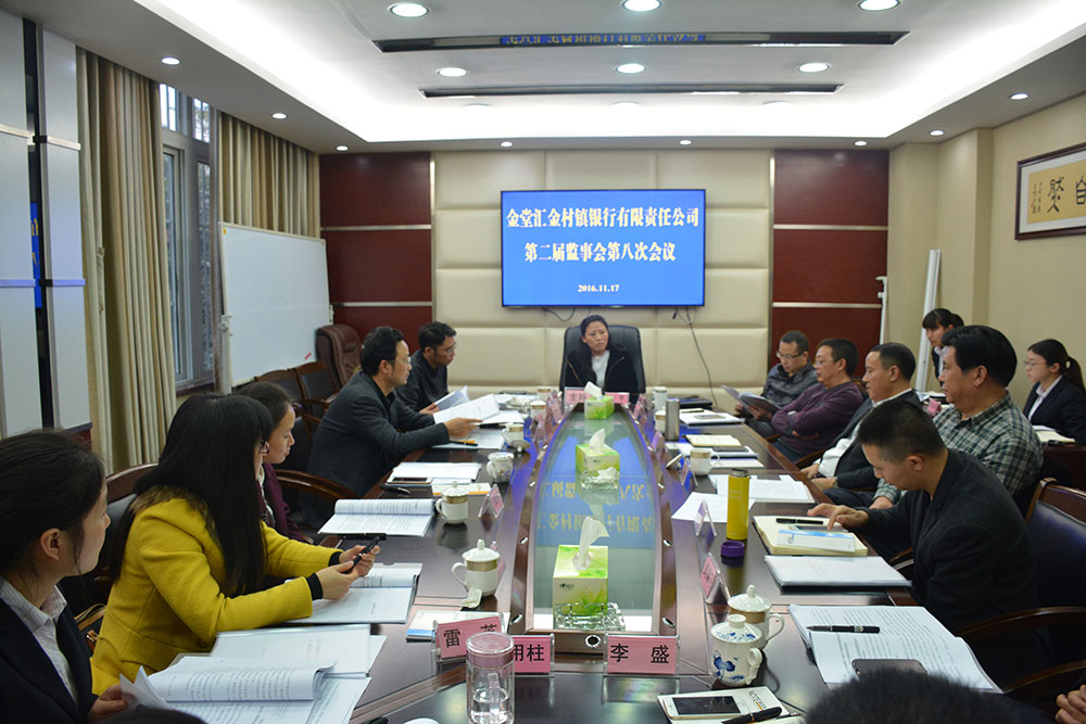 2016年11月17日,金堂汇金村镇银行(以下简称我行)第二届监事会第八次会议在总部会议室顺利召开。四川银监局金堂监管办主任雷仕文、人民银行金堂县支行副行长张灏、县银监办监管员陈才玺莅临指导。会议由监事长艾平主持,经营管理层领导及原监事列席会议。