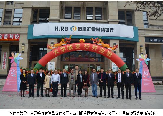 2016年10月27日,金堂汇金村镇银行第五个营业网点大学城支行盛装开业,人民银行金堂县支行副行长郭珩,四川银监局金堂监管办主任雷仕文,三星镇政府领导,成都文理学院、西南航空专修学院、西南交大希望学院院领导以及企业客户代表等到场祝贺,本行董事长甘永军、行长吴鲜平、监事长艾平、副行长代光辉、行长助理李盛,相关支行部门负责人参加了开业庆典。