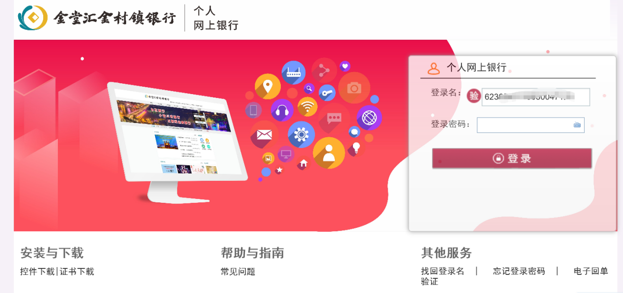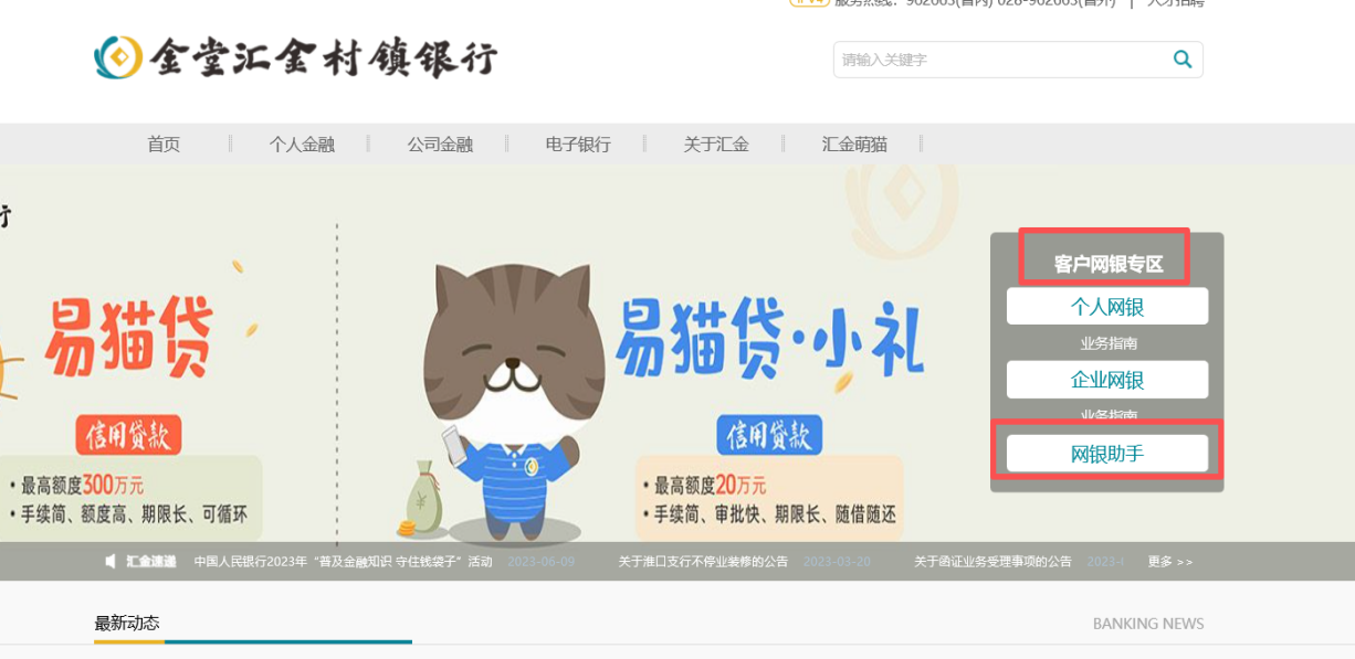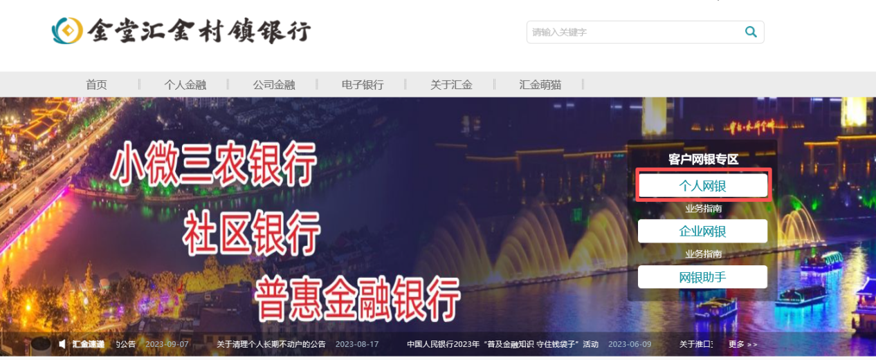访问金堂汇金村镇银行网站,并选择“个人网银”进行登录。如图所示。