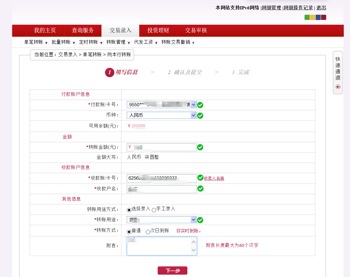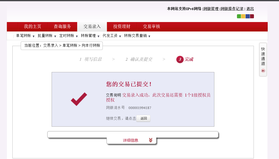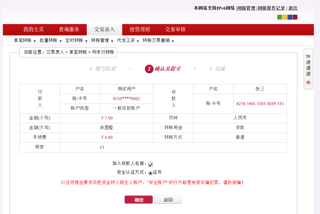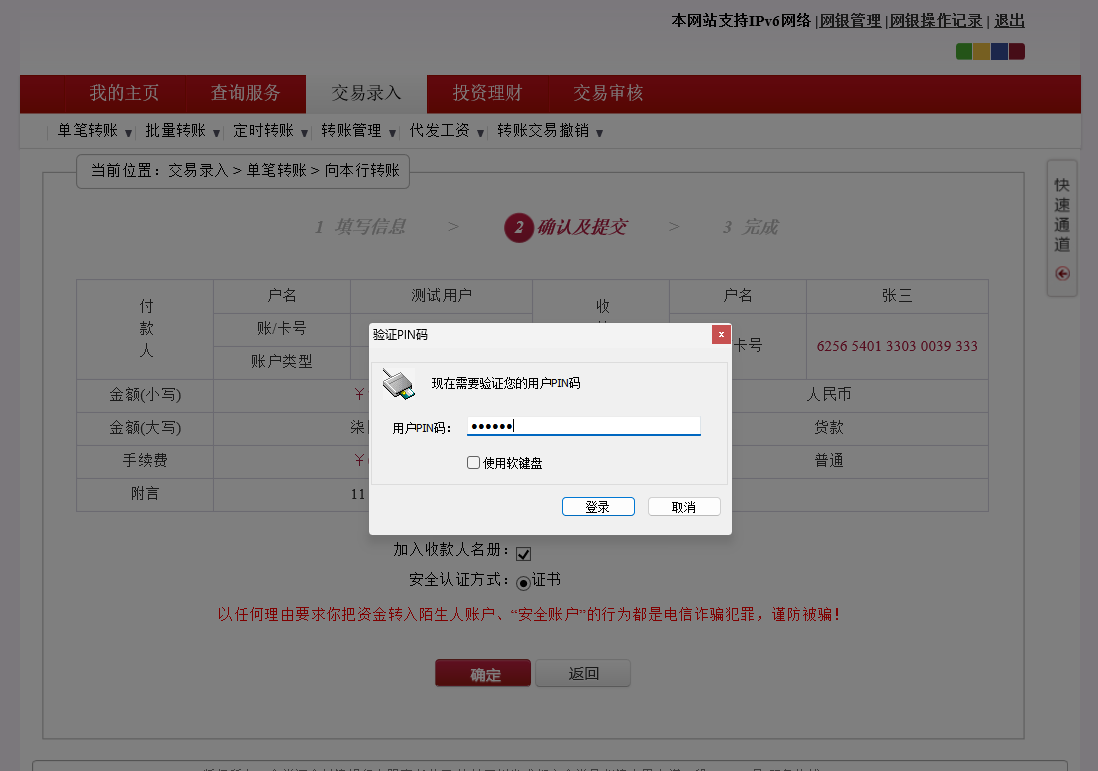 登录成功后,点击“交易录入”→“单笔转账”—“向本行转账”或“向他行转账”菜单→填写汇款信息,点击“提交”,进入转账确认页面。