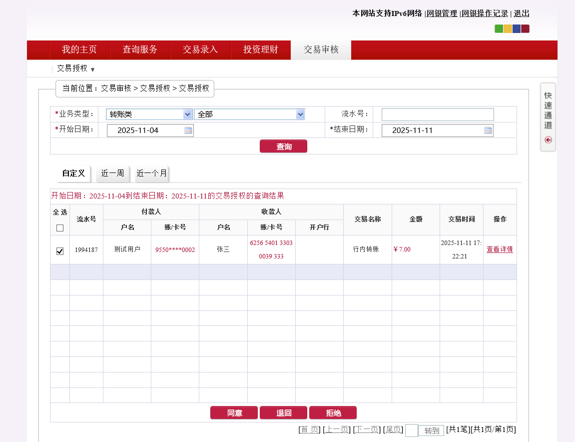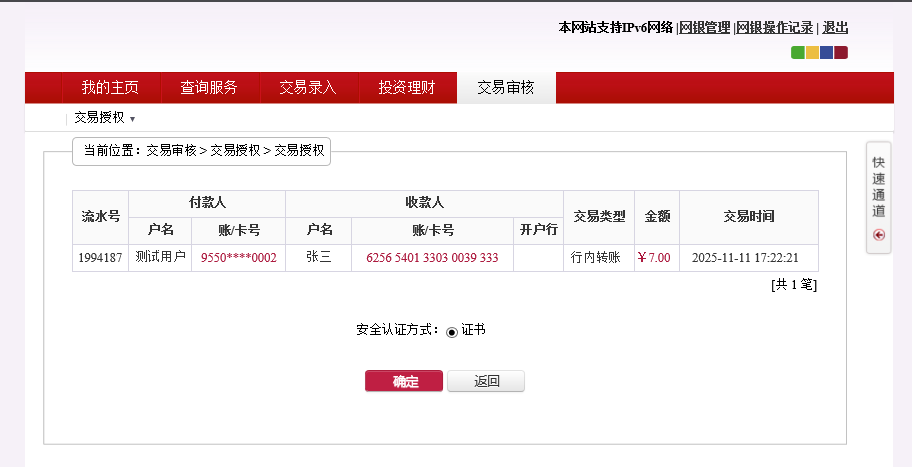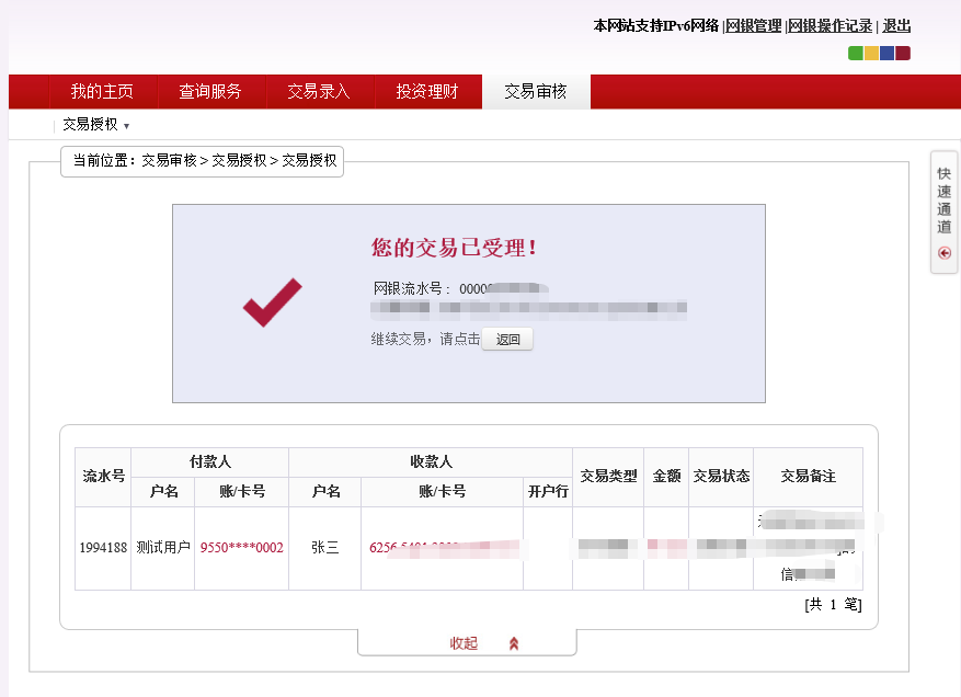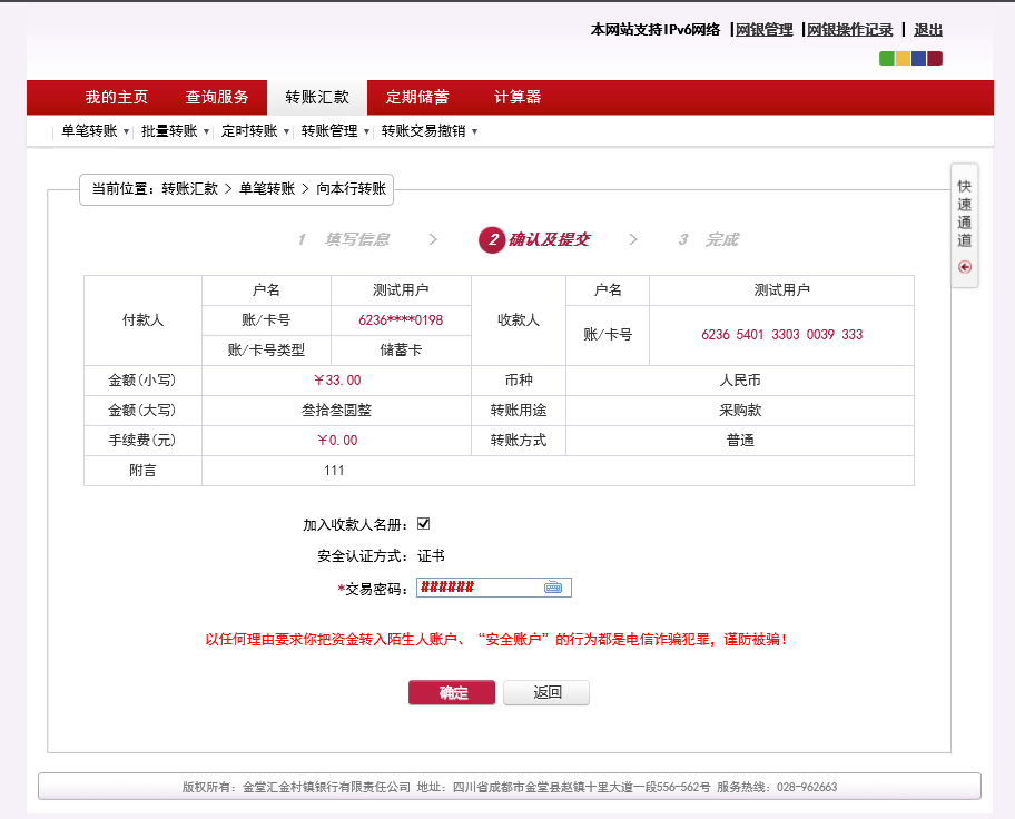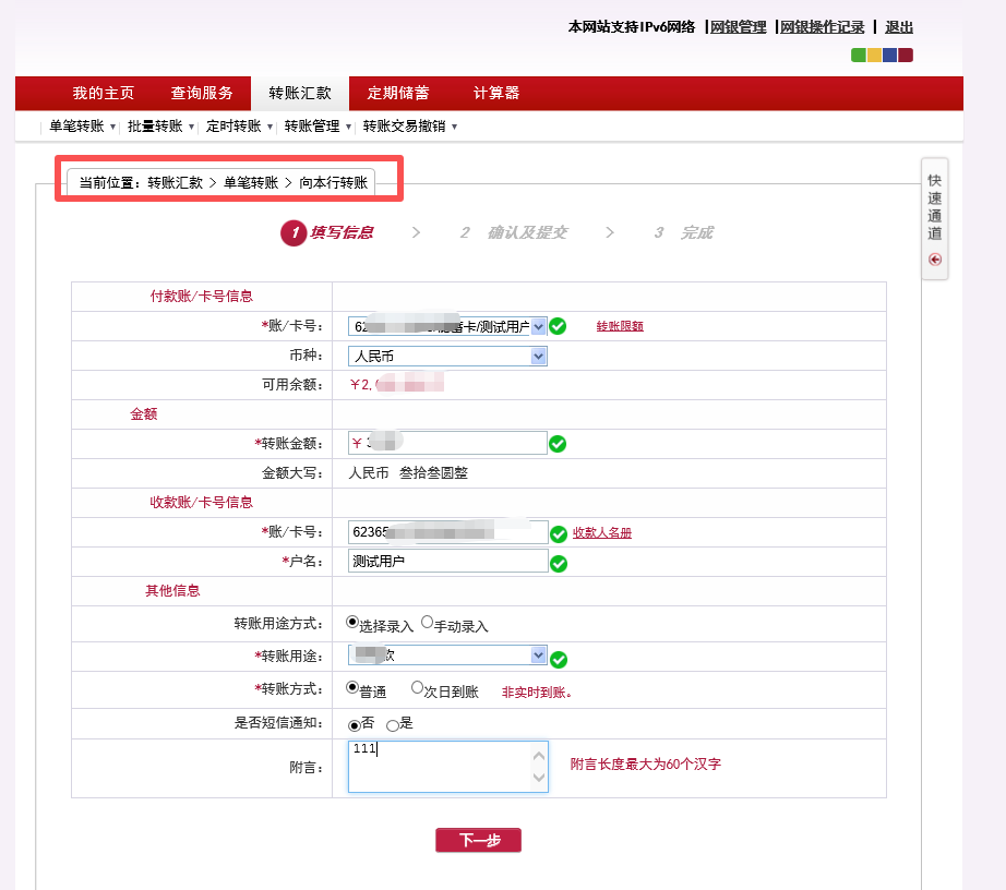 登录成功后,点击“交易录入”→“单笔转账”—“向本行转账”或“向他行转账”菜单→填写汇款信息,点击“提交”,进入转账确认页面。