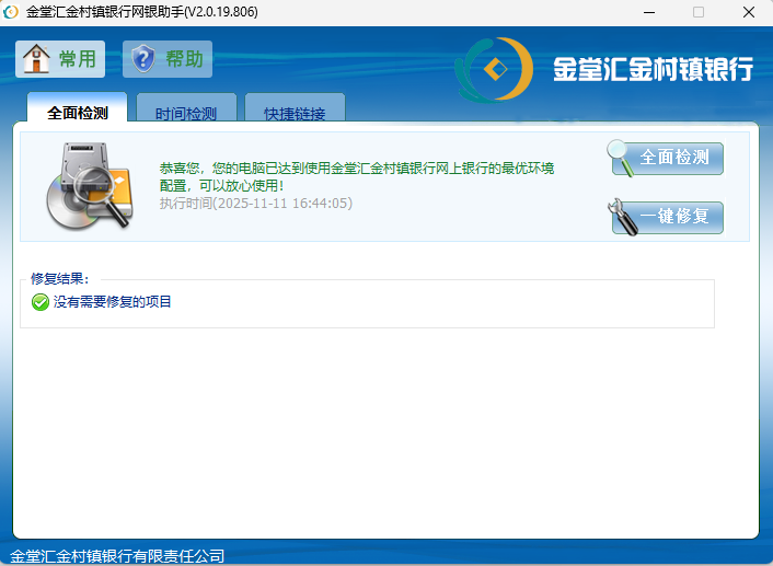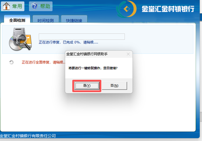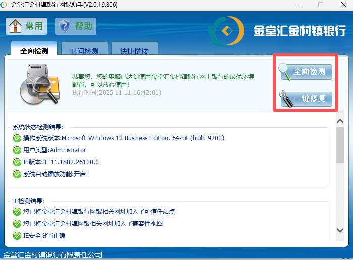 网银助手会自动修复网银使用环境,修复成功后,页面提示“恭喜您,您的电脑已达到使用金堂汇金村镇银行网上银行的最优环境配置,可以放心使用!”