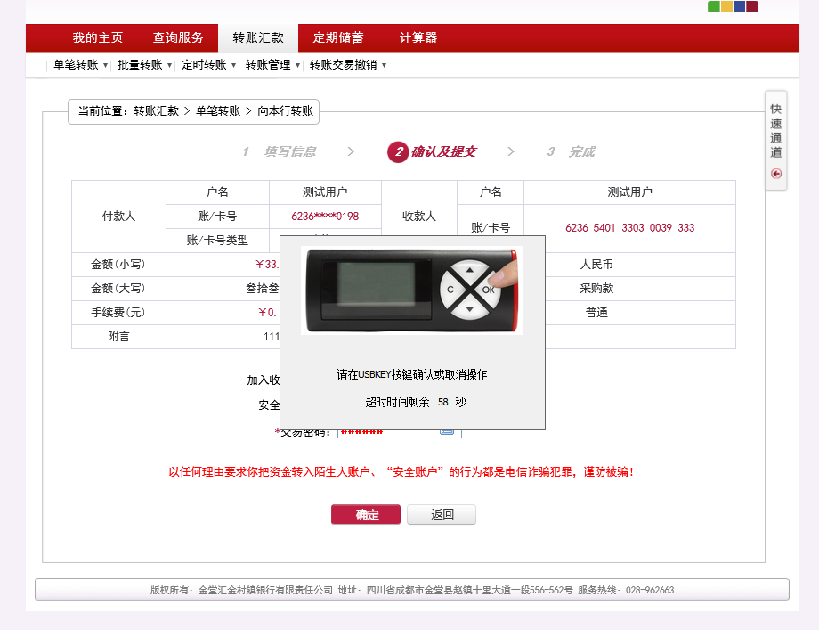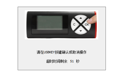 PIN码验证通过后,网银将弹出转账确认对话框,此时USBkey屏幕将显示交易账号和金额等重要交易信息,请仔细查看USBkey的显示信息和实际的交易信息是否一致,一致则按USBkey的“OK”键确认,否则请按“OK”键取消该交易。“OK”键确认后,交易完成。