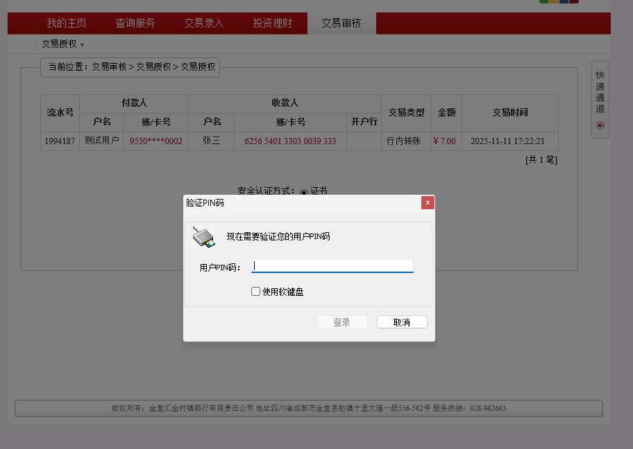 插入USBkey,输入账户交易密码,点击“确定”。弹出USBkeyPIN码输入页面。