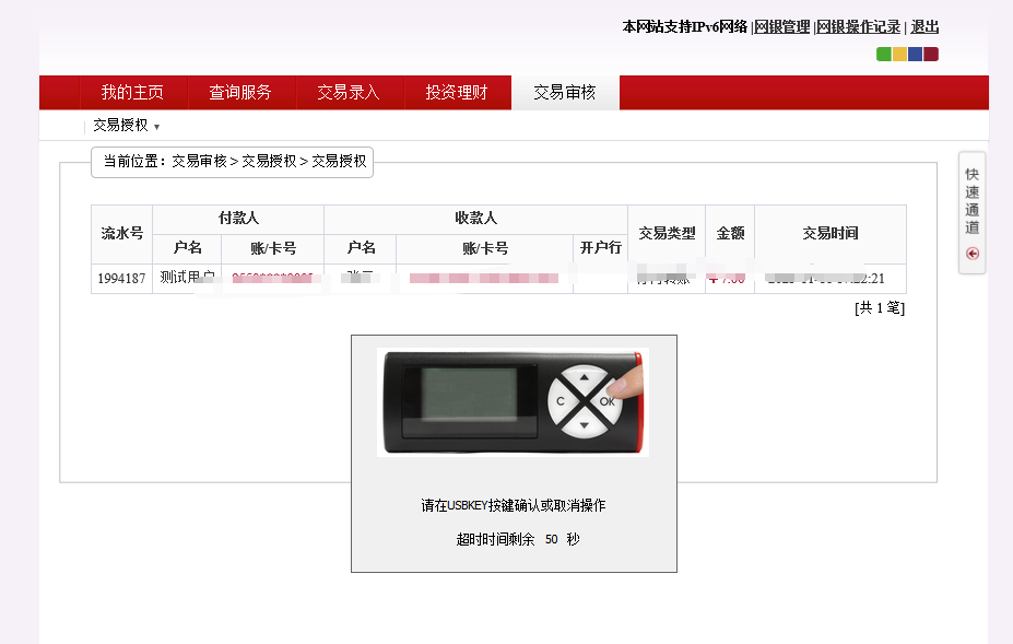 PIN码验证通过后,网银将弹出转账确认对话框,此时USBkey屏幕将显示交易账号和金额等重要交易信息,请仔细查看USBkey的显示信息和实际的交易信息是否一致,一致则按USBkey的“OK”键确认,否则请按“C”键取消该交易。“OK”键确认后,转账指令录入完成,审核员审核完成后,交易完成。