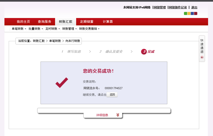 温馨提示:对于大额转账,需要银行落地审核后,转账资金方可出行。