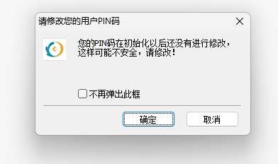 如果您的USBkey密码没有修改过,插入USBkey后系统会弹出修改PIN码的提示(如图所示)。